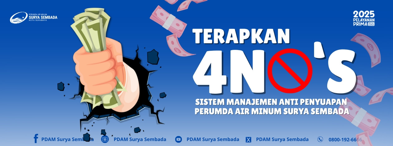 PERUMDA Air Minum Surya Sembada telah tersertifikasi ISO 37001:2016. Jika anda menemukan praktik pungli atau permintaan biaya tidak resmi oleh PETUGAS saat layanan Perumda Air Minum Surya Sembada Kota Surabaya, SEGERA LAPORKAN!!!!